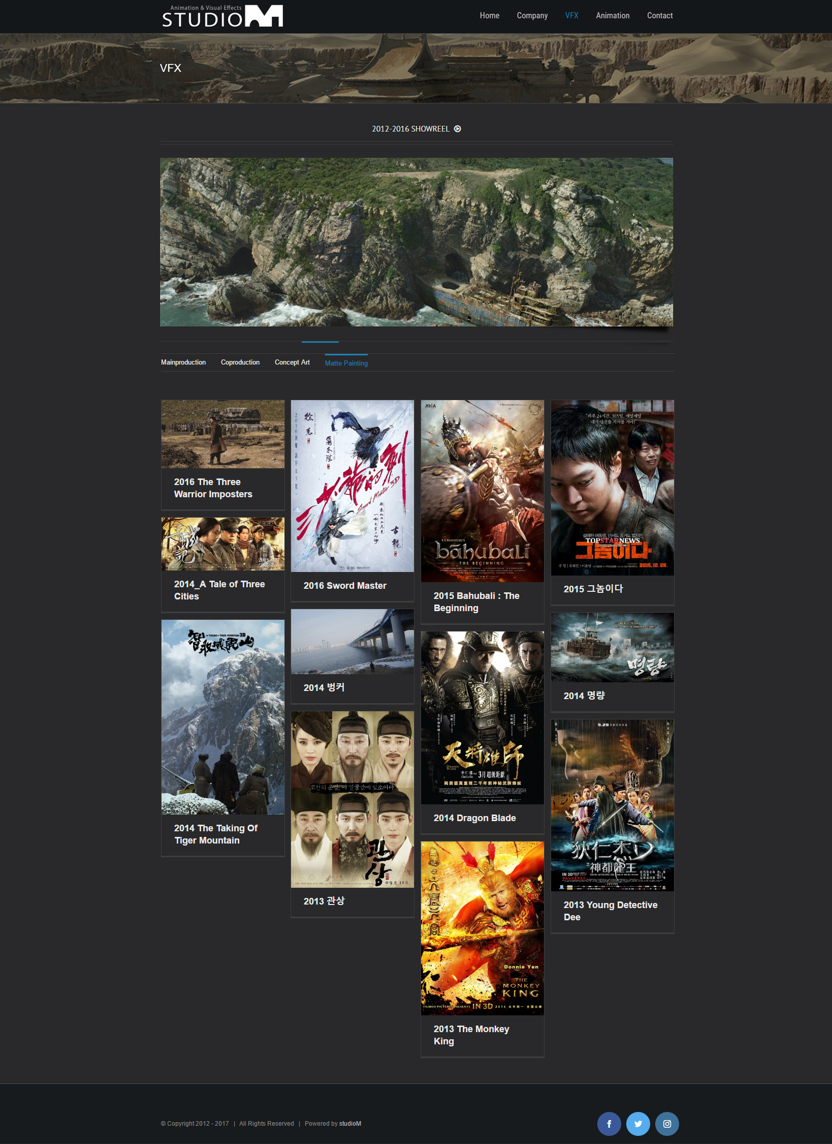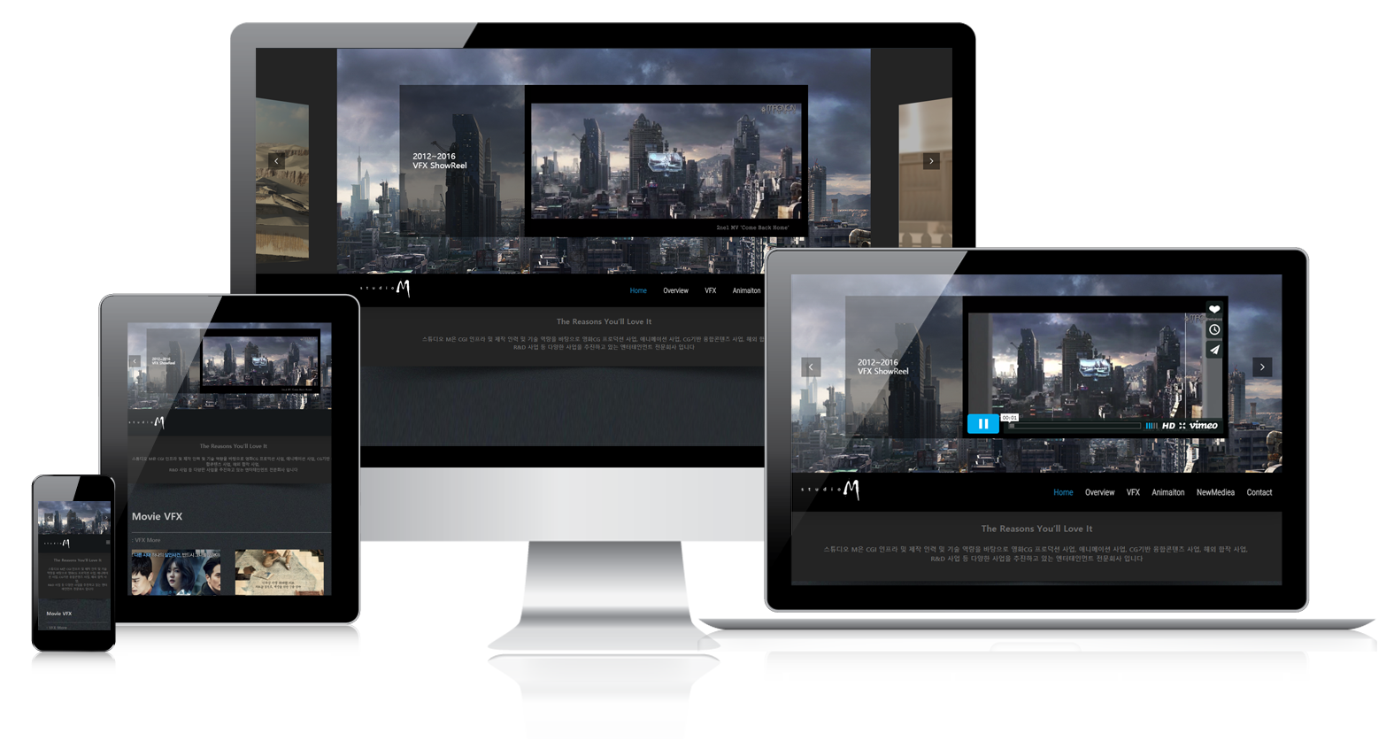 메인페이지에 VFX와 애니메이션 작업물 이미지를 최대한 전시할 목표로 레이아웃을 구성하였고, 3가지 비즈니스 파트별로 나눠 구성하였습니다. 전반적으로 어두운 컬러의 디자인을 적용해 작품 가독성을 높이고, 이미지가 많은 메인페이지에서 플러그인 같은 추가 기능 요소는 배제하여 깔끔한 레이아웃을 완성하였습니다.